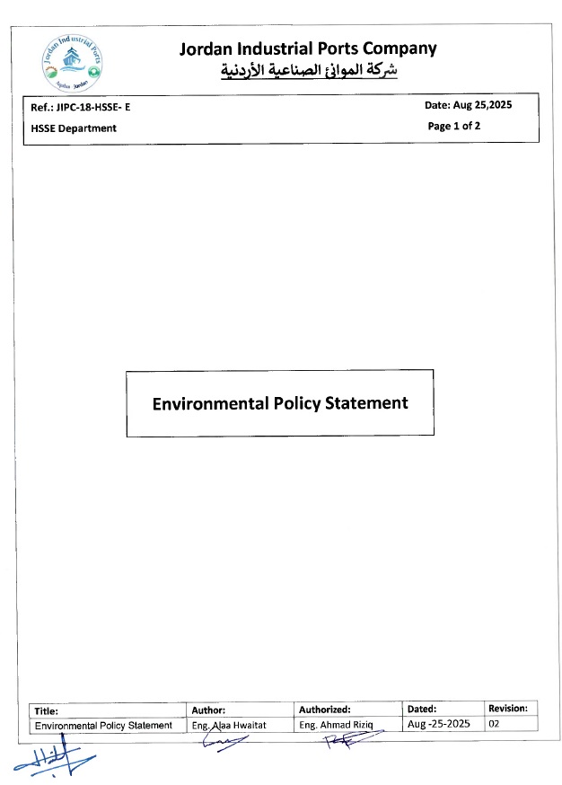 Jordan Industrial Ports Company is committed to achieve and maintain excellence in all aspects of its Health, Safety, Security, and Environmental (HSSE) matters. This includes conducting the business in a way that protects the work environment, security, health and safety for our employees, contractors, visitors, and the surrounding community. JIPC sets high standards and policies for the continued improvement of HSSE performance also reflected on achieving its goals.